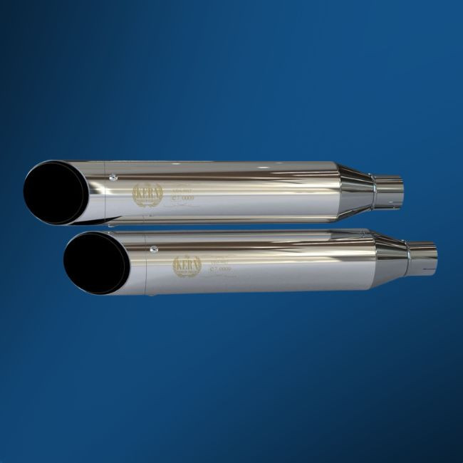 By Kern Premium Exhaust, aus hochglanzpoliertem Edelstahl für Harley-Davidson Dyna Modelle mit traditionellem Auspufflayout.