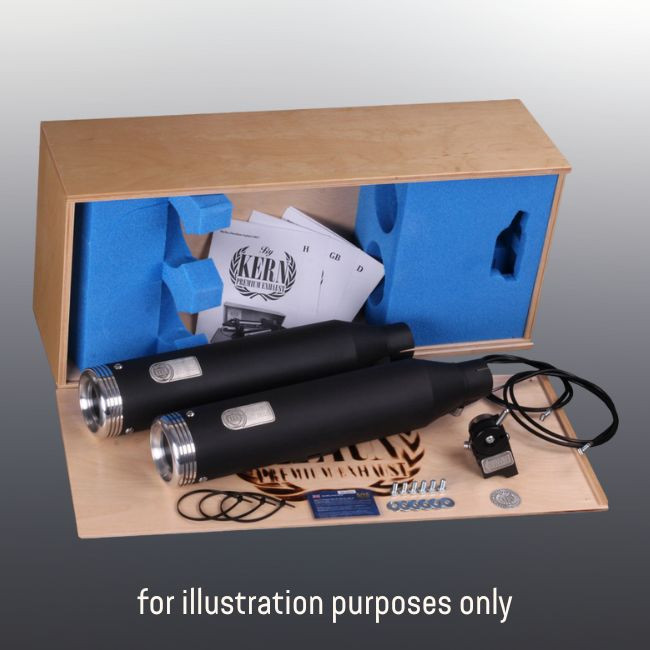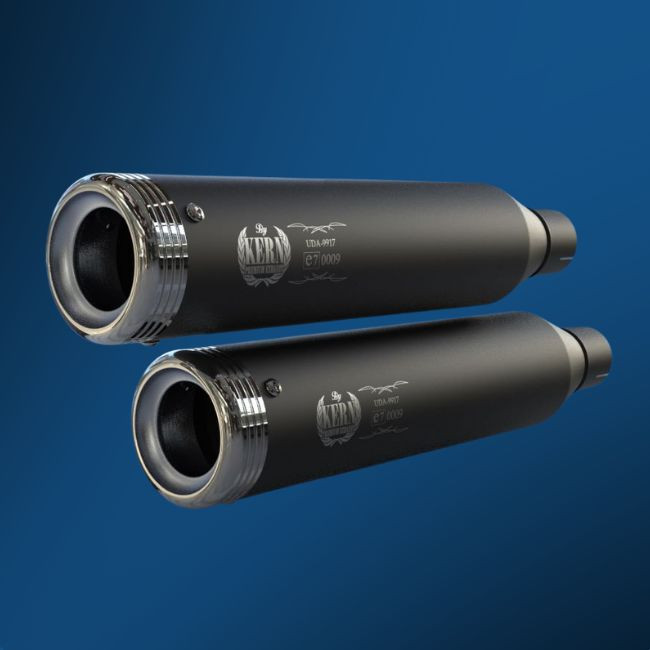 Der By Kern Premium Exhaust ist ein schwarz lackierter Auspuff für Harley-Davidson Softail Modelle mit klassischem Auspufflayout (Delux).